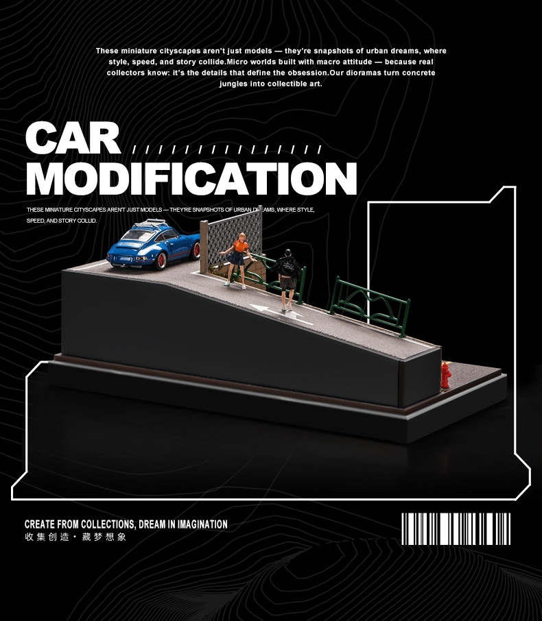 Tái hiện cảnh phố dốc sống động cho bộ sưu tập 1:64. Thiết kế garage mini + hộp mica chống bụi, phù hợp setup bàn làm việc hoặc tủ trưng bày.